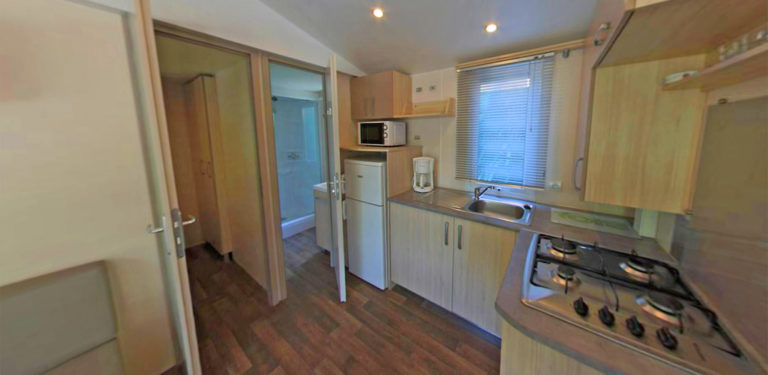 Séjour / Cuisine: cuisine aménagée avec 4 feux gaz, réfrigérateur et congélateur, micro-ondes, cafetière électrique,